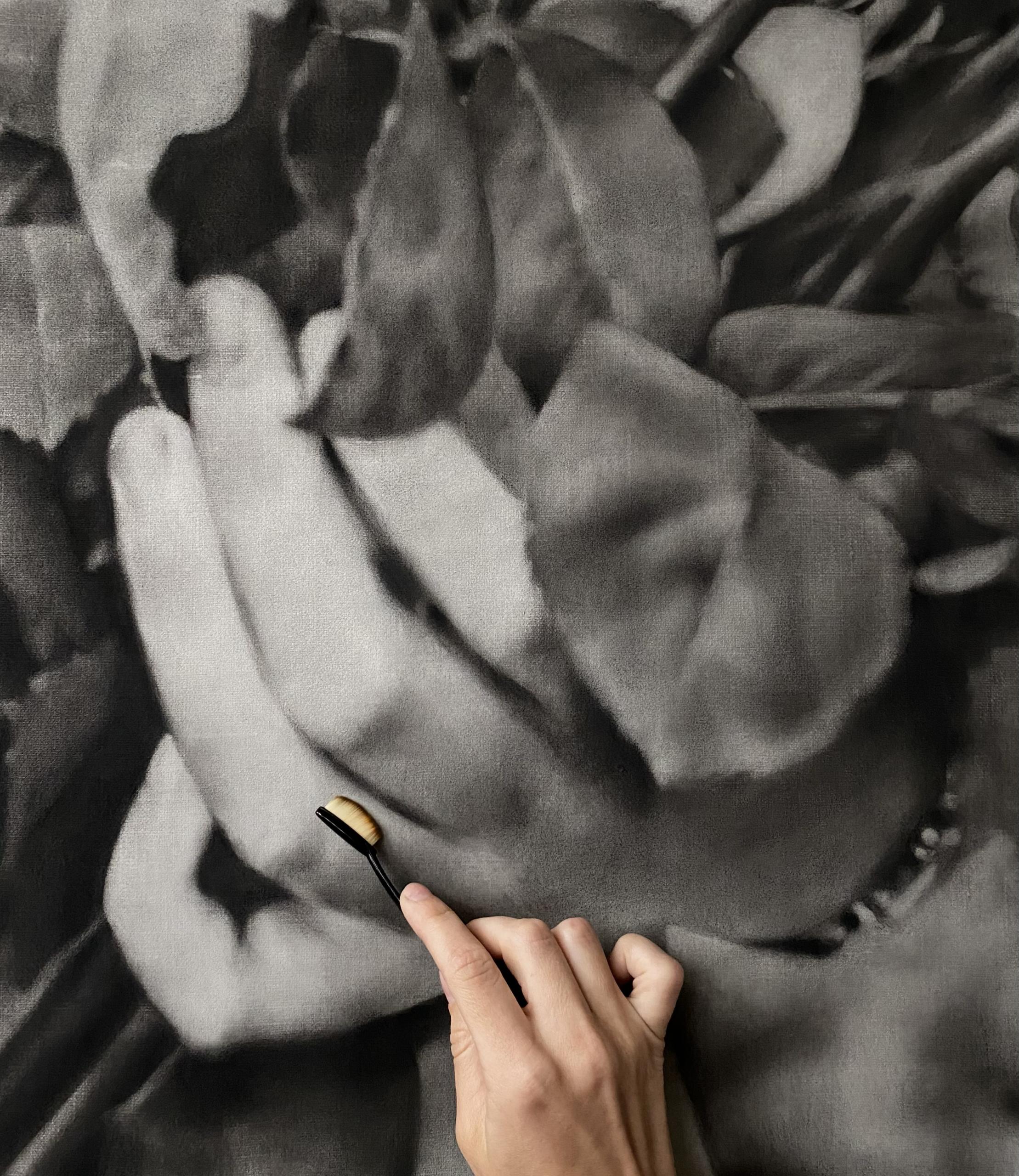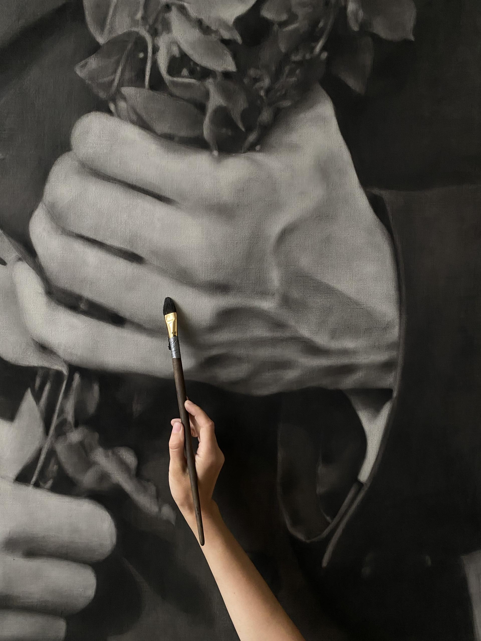 It is a series of charcoal drawings portraying roses in bloom. For nearly 25 years, I’ve been collecting photographs — and one recurring image stands out: blooming roses held in the hands of young people. Women dressed in white, men in grey suits, holding roses with quiet intent. There’s something fragile, beautiful, and undeniably melancholic about these moments. They all stand still, faces serious — but it’s not the faces I care about. What draws me in are the hands. The way they hold the flowers. The intimate tension where thorn meets skin. That brief, intense moment when beauty becomes danger.